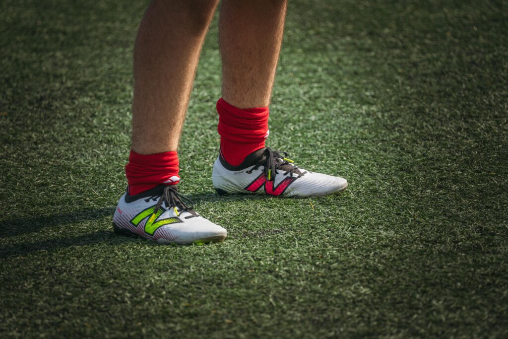 Dynamic shot of a soccer player's foot on a vivid orange ball on a lush green field.
